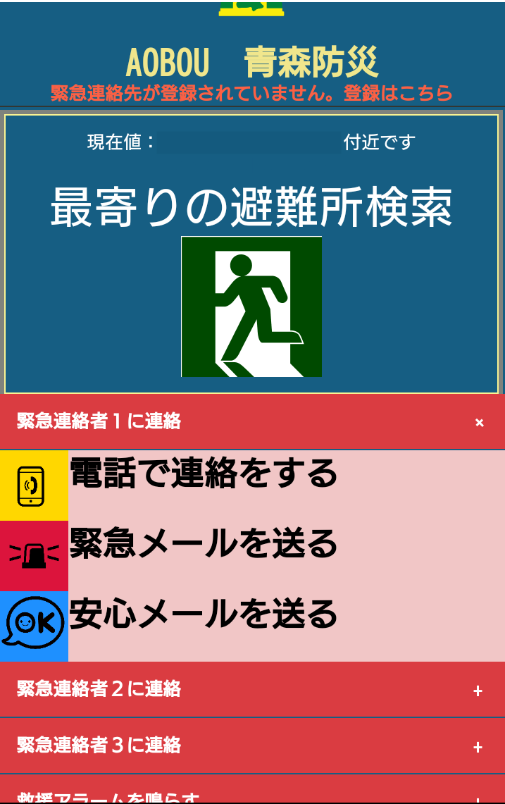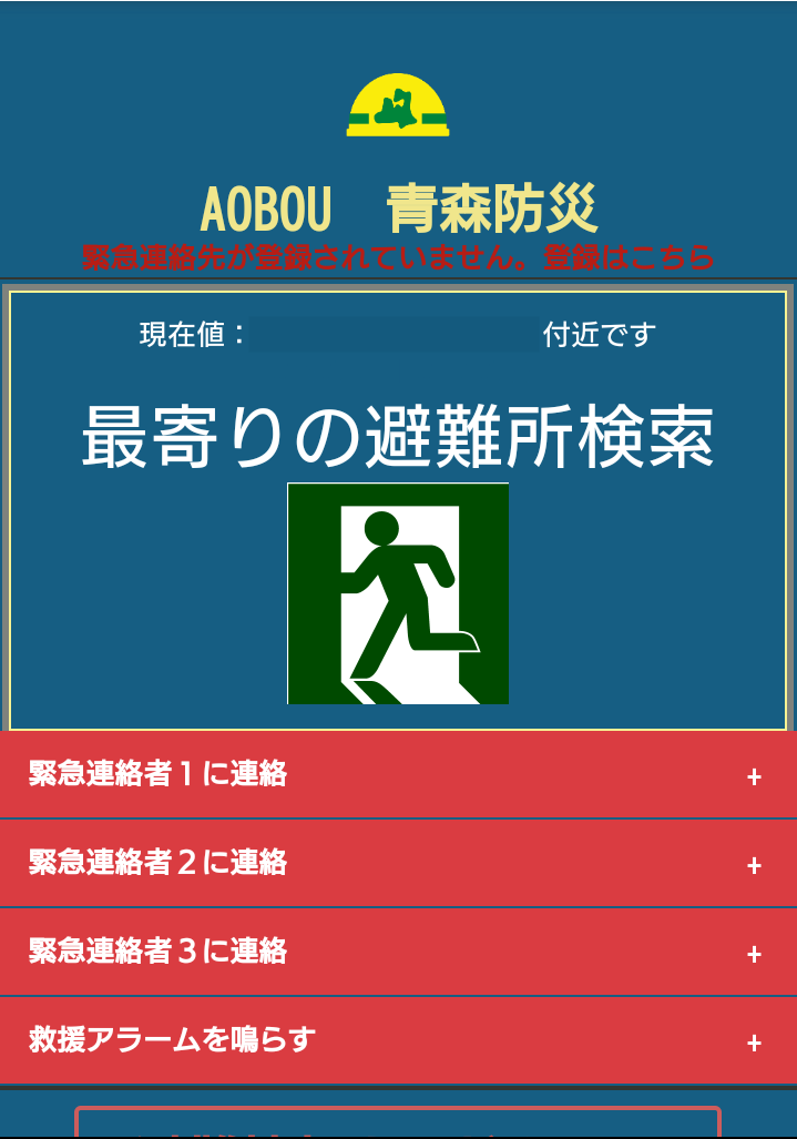 Webサイトにアクセス、アプリインストールすると最初に表示される画面です。ここから避難所検索、緊急連絡がすぐにできます。