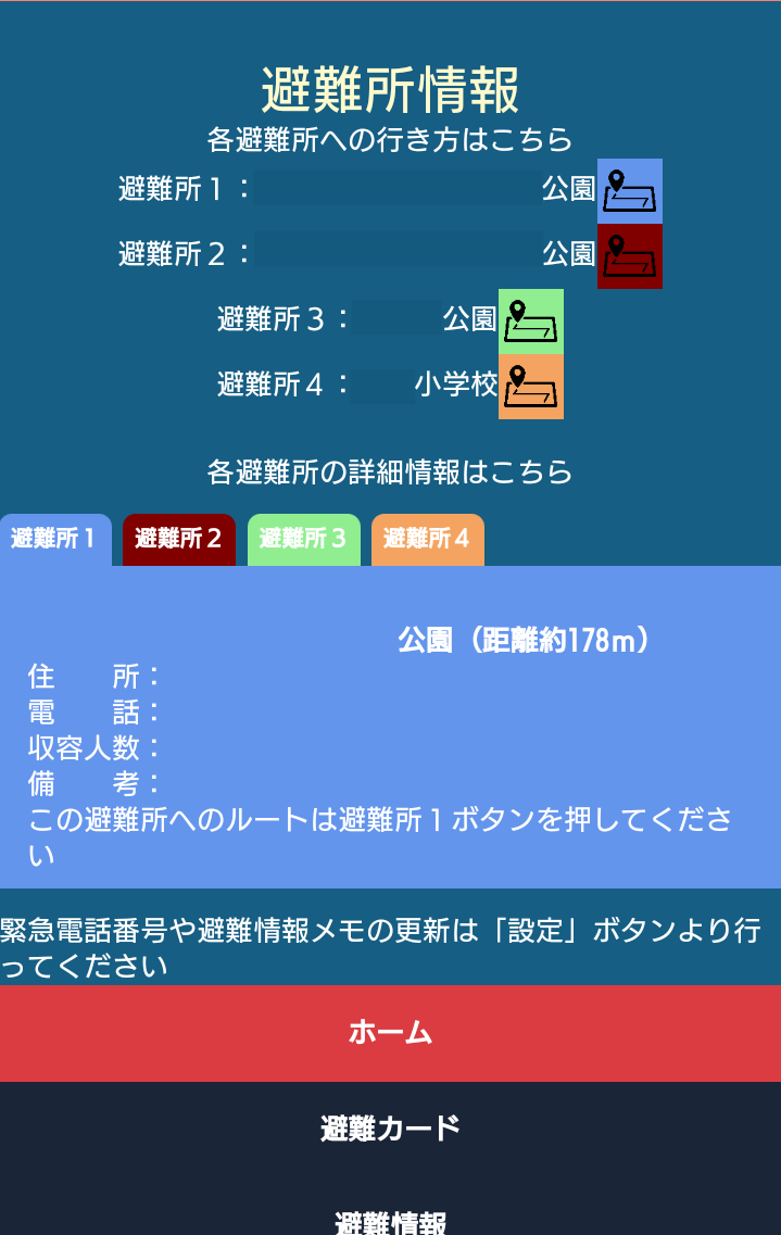 災害ケースにより、最寄り避難所が適切ではないと判断した場合でも、最大4箇所最寄りの避難所を表示できます。