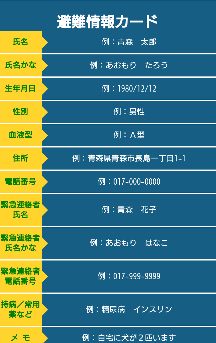 避難した際、自分の事や家族の事、服用薬など第三者に的確に伝える為に個人カードを作成することができます。