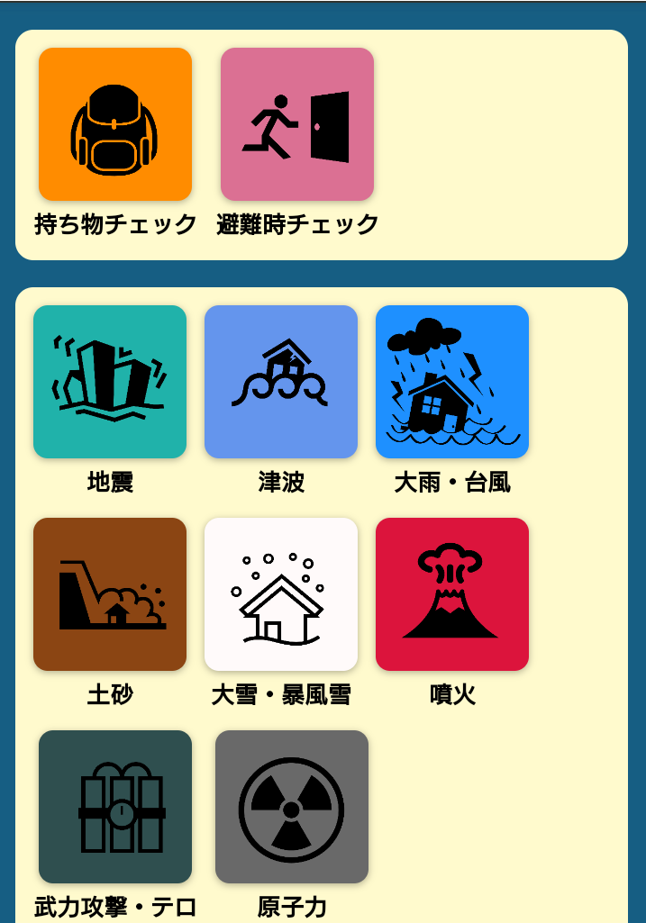 避難時必要な情報、避難所へ持っていけばよい持ち物、災害のケースによりすべき行動などさまざまな情報を確認することができます。